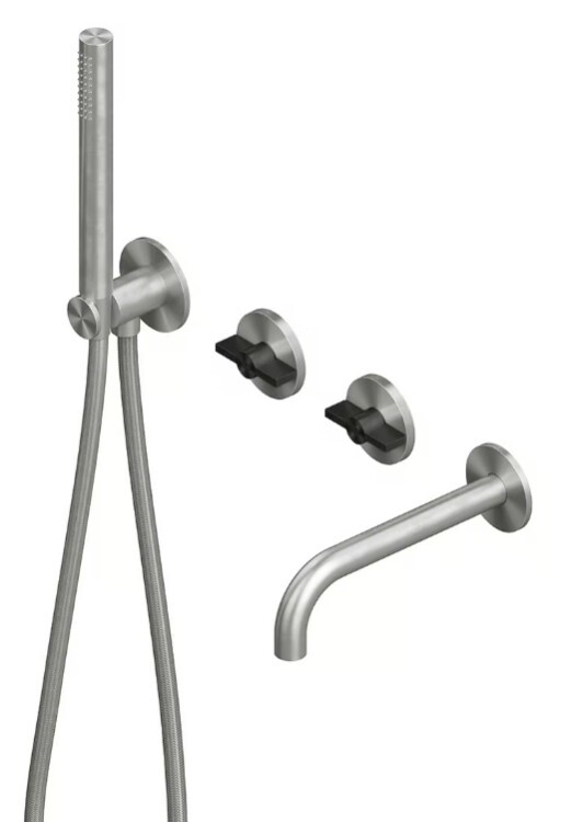 Смеситель для ванны и душа, Quadro design, Valvola01, на 2 потребителя, тип открывания воды-вентильный, тип регулирования воды-прогрессивный картридж, монтаж-настенный встраиваемый, отверстия для монтажа-4, вынос излива, мм-192, тип излива-неподвижный, цвет ручки-золото черное, ручной душ-в комплекте, внутренняя часть-необходимо заказать (2 шт.), цвет-сталь брашированная/золото черное Смеситель для ванны и душа, Quadro design, Valvola01, на 2 потребителя, цвет-сталь брашированная/золото черное