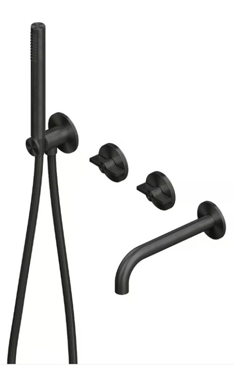 Смеситель для ванны и душа, Quadro design, Valvola01, на 2 потребителя, тип открывания воды-вентильный, тип регулирования воды-прогрессивный картридж, монтаж-настенный встраиваемый, отверстия для монтажа-4, вынос излива, мм-192, тип излива-неподвижный, ручной душ-в комплекте, внутренняя часть-необходимо заказать (2 шт.), цвет-золото черное Смеситель для ванны и душа, Quadro design, Valvola01, на 2 потребителя, цвет-золото черное
