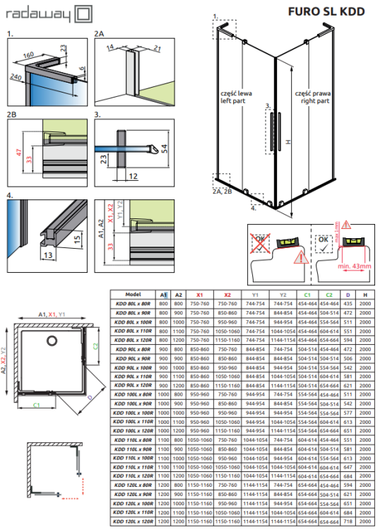 Дверь, Radaway, Furo SL, ширина, мм-900, высота, мм-2000, установка-с секцией двери (угловой вход), открывание-раздвижное, петли-слева, цвет фурнитуры-золото брашированное, материал-стекло, цвет стекла-прозрачный, без декора, вид грязеотталкивающего/антибак покрытия-Easy Clean Дверь, Radaway, Furo SL, шв 900*2000, петли-слева, золото брашированное, цвет стекла-прозрачный, Easy Clean