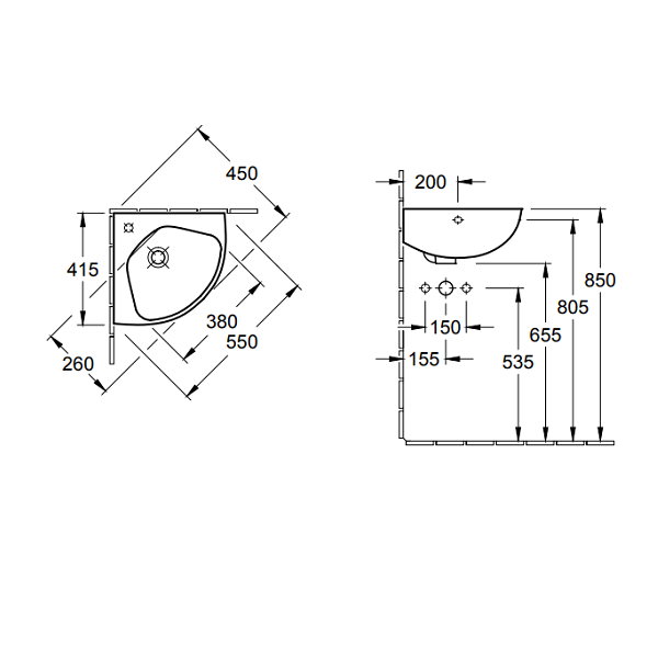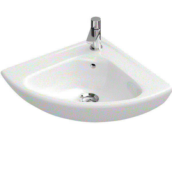Раковина, Villeroy&Boch, O'Novo, ширина, мм-415, глубина, мм-450, тип установки-угловой, отверстия для смесителя-одно, перелив-есть, цвет-альпийский белый Раковина, Villeroy&Boch, O'Novo, шг 415*450, цвет-альпийский белый