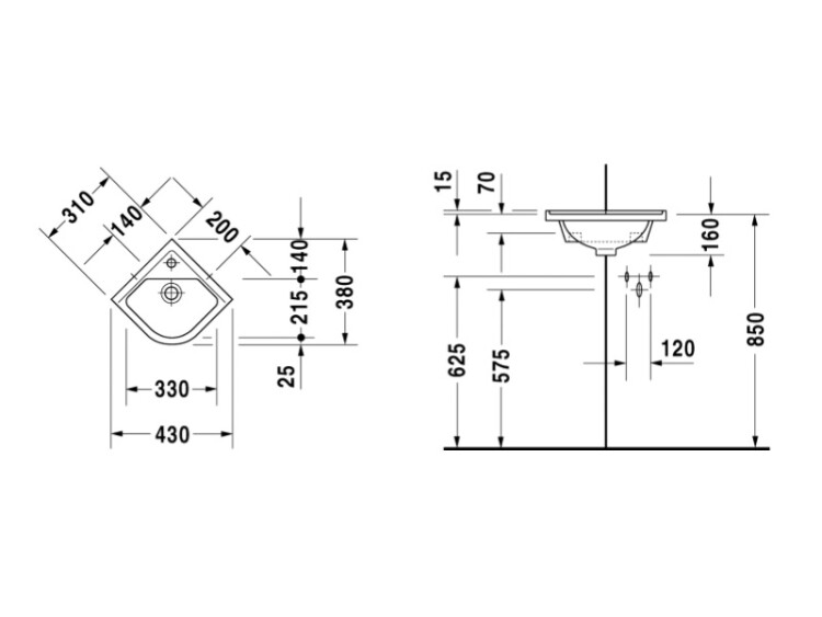 Раковина, Duravit, Starck 3, ширина, мм-430, глубина, мм-380, высота, мм-175, тип установки-угловой/подвесной, отверстия для смесителя-1, перелив-есть, материал-керамика, цвет-белый, с плоскостью под смеситель, глазуровка-снизу Раковина, Duravit, Starck 3, шгв 430*380*175, отверстия для смесителя-1, цвет-белый