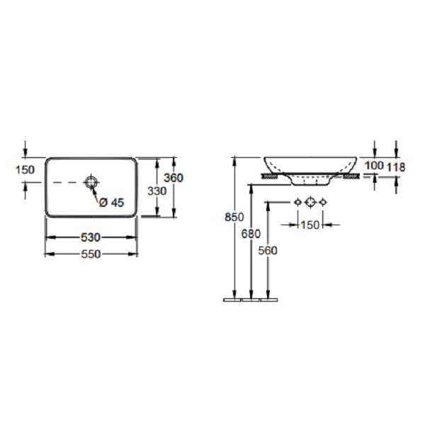 Раковина, Villeroy&Boch, Venticello, ширина, мм-550, глубина, мм-360, отверстия для смесителя-отсутствуют, перелив-есть, декор-без декора, материал-санфарфор, цвет-альпийский белый Раковина, Villeroy&Boch, Venticello, шг 550*360, цвет-альпийский белый
