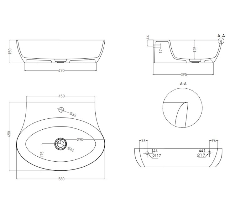 Раковина, Salini, ALDA Wall 01, ширина, мм-580, глубина, мм-450, высота, мм-150, тип установки-подвесной/накладной, отверстия для смесителя-отсутствуют, без перелива, донный клапан-необходимо заказать, материал-S-Stone (искуственный камень), цвет-белый Раковина, Salini, ALDA Wall 01, шгв 580*450*150, отверстия для смесителя-отсутствуют, цвет-белый