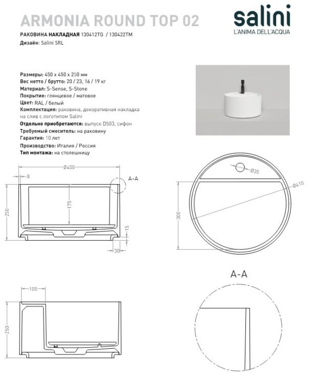 Раковина, Salini, Armonia Round Top, ширина, мм-450, глубина, мм-450, высота, мм-250, тип установки-накладной (настольный), отверстия для смесителя-1, без перелива, материал-S-Stone (искуственный камень), в комплект входит-декоративная накладка на слив, цвет-белый матовый Раковина, Salini, Armonia Round Top, шгв 450*450*250, отверстия для смесителя-1, цвет-белый матовый