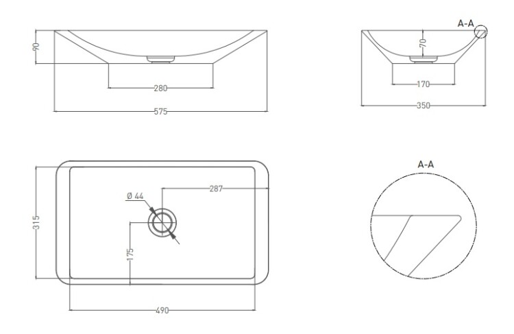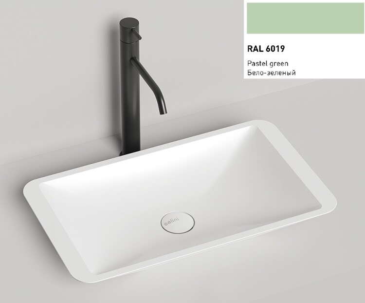 Раковина, Salini, Callista 03, ширина, мм-575, глубина, мм-350, высота, мм-90, тип установки-накладной (настольный), отверстия для смесителя-отсутствуют, без перелива, без донного клапана, материал-S-Stone (искуственный камень), цвет-RAL6019 матовый снаружи/белый матовый внутри Раковина, Salini, Callista 03, шгв 575*350*90, отверстия для смесителя-отсутствуют, цвет-RAL6019 матовый снаружи/белый матовый внутри