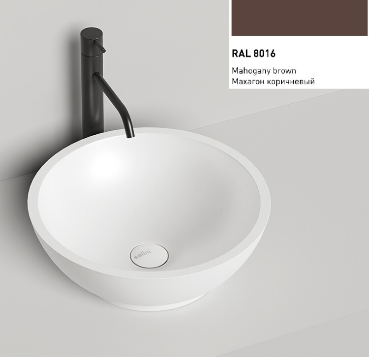Раковина, Salini, Gloria, ширина, мм-415, глубина, мм-415, высота, мм-150, тип установки-накладной (настольный), отверстия для смесителя-отсутствуют, без перелива, без донного клапана, материал-искусственный камень, S-Stone, цвет внутри и снаружи-RAL8016 матовый Раковина, Salini, Gloria, шгв 415*415*150, отверстия для смесителя-отсутствуют, цвет внутри и снаружи-RAL8016 матовый