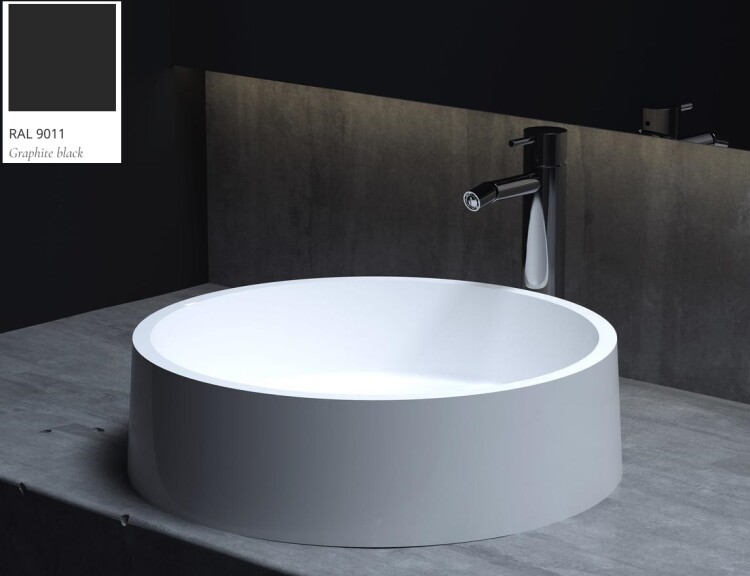 Раковина, Salini, Gloria, ширина, мм-440, глубина, мм-440, высота, мм-125, тип установки-накладной (настольный), отверстия для смесителя-отсутствуют, без перелива, без донного клапана, материал-искусственный камень, S-Stone, покрыта S-Sense, цвет снаружи-RAL9011 глянцевый, цвет внутри-белый глянцевый Раковина, Salini, Gloria, шгв 440*440*125, отверстия для смесителя-отсутствуют, цвет снаружи-RAL9011 глянцевый, цвет внутри-белый глянцевый