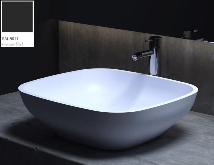 Раковина, Salini, Gloria, ширина, мм-495, глубина, мм-445, высота, мм-150, тип установки-накладной (настольный), отверстия для смесителя-отсутствуют, без перелива, без донного клапана, материал-искусственный камень, S-Stone, цвет внутри и снаружи-RAL9011 матовый Раковина, Salini, Gloria, шгв 495*445*150, отверстия для смесителя-отсутствуют, цвет внутри и снаружи-RAL9011 матовый