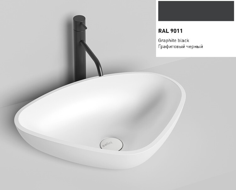 Раковина, Salini, Gloria, ширина, мм-560, глубина, мм-390, высота, мм-165, тип установки-накладной (настольный), отверстия для смесителя-отсутствуют, без перелива, без донного клапана, материал-искусственный камень, S-Stone, цвет-RAL9011 матовый снаружи/белый матовый внутри Раковина, Salini, Gloria, шгв 560*390*165, отверстия для смесителя-отсутствуют, цвет-RAL9011 матовый снаружи/белый матовый внутри