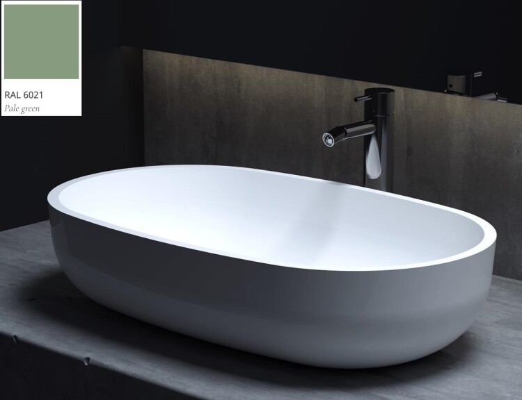Раковина, Salini, Gloria, ширина, мм-640, глубина, мм-385, высота, мм-145, тип установки-накладной (настольный), отверстия для смесителя-отсутствуют, без перелива, без донного клапана, материал-искусственный камень, S-Stone, цвет-внутри и снаружи-RAL6021 матовый Раковина, Salini, Gloria, шгв 640*385*145, отверстия для смесителя-отсутствуют, цвет-внутри и снаружи-RAL6021 матовый