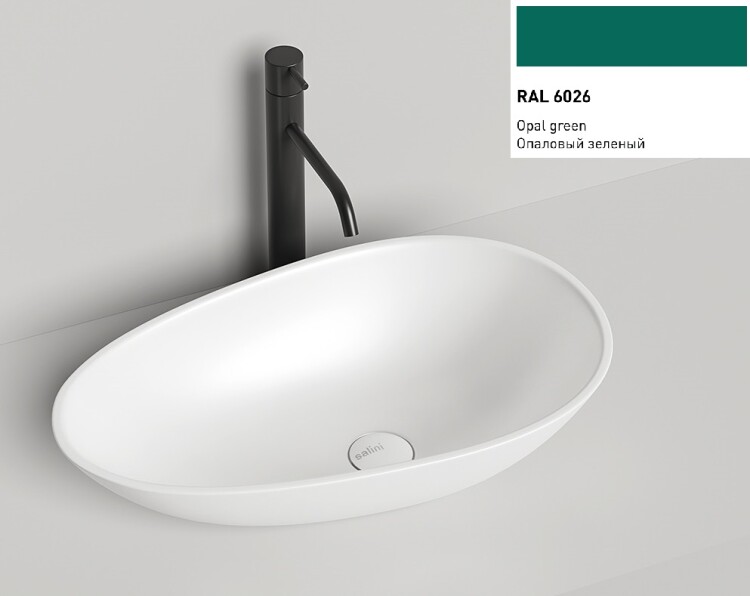 Раковина, Salini, Paola, ширина, мм-580, глубина, мм-345, высота, мм-140, тип установки-накладной (настольный), отверстия для смесителя-отсутствуют, без перелива, без донного клапана, материал-искусственный камень, S-Stone, цвет внутри и снаружи-RAL6026 матовый Раковина, Salini, Paola, шгв 580*345*140, отверстия для смесителя-отсутствуют, цвет внутри и снаружи-RAL6026 матовый