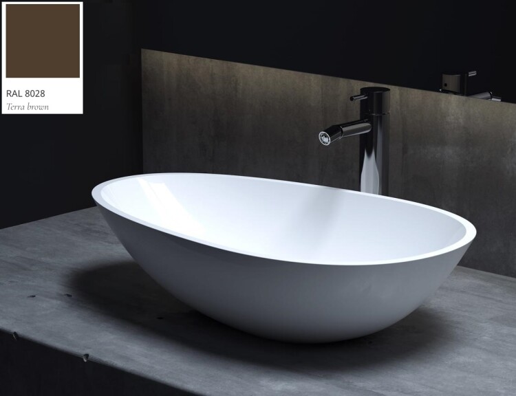 Раковина, Salini, Paola, ширина, мм-580, глубина, мм-345, высота, мм-140, тип установки-накладной (настольный), отверстия для смесителя-отсутствуют, без перелива, без донного клапана, материал-искусственный камень, S-Stone, цвет внутри и снаружи-RAL8028 матовый Раковина, Salini, Paola, шгв 580*345*140, отверстия для смесителя-отсутствуют, цвет внутри и снаружи-RAL8028 матовый
