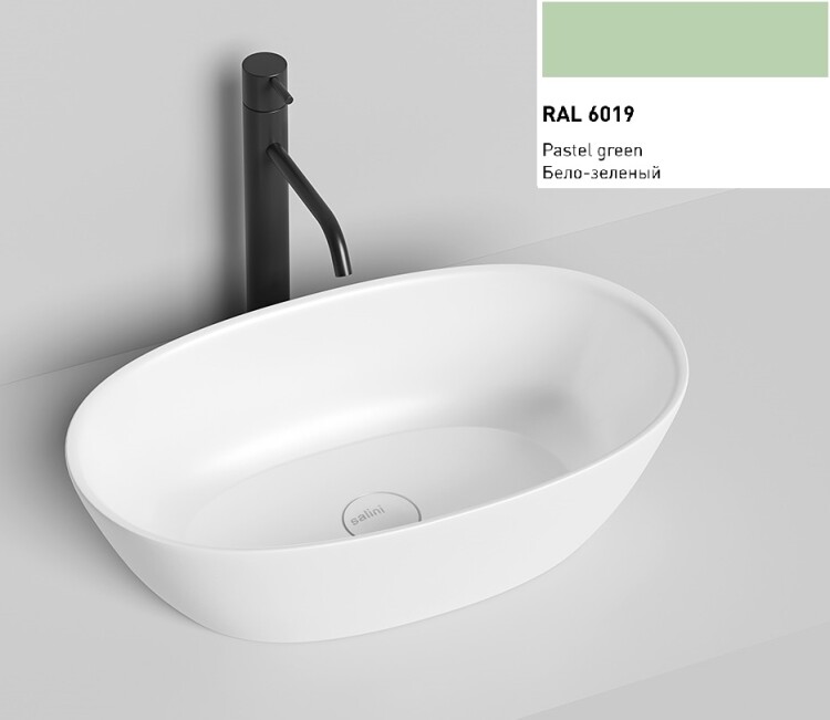 Раковина, Salini, Sofia, ширина, мм-555, глубина, мм-330, высота, мм-150, тип установки-накладной (настольный), отверстия для смесителя-отсутствуют, без перелива, без донного клапана, материал-искусственный камень, S-Stone, цвет-RAL6019 матовый снаружи/белый матовый внутри Раковина, Salini, Sofia, шгв 555*330*150, отверстия для смесителя-отсутствуют, цвет-RAL6019 матовый снаружи/белый матовый внутри