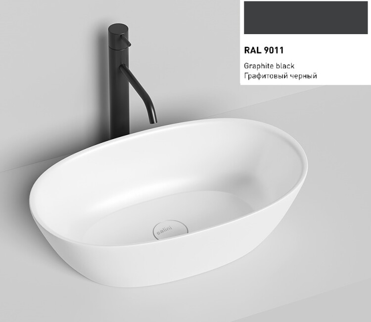 Раковина, Salini, Sofia, ширина, мм-555, глубина, мм-330, высота, мм-150, тип установки-накладной (настольный), отверстия для смесителя-отсутствуют, без перелива, без донного клапана, материал-искусственный камень, S-Stone, цвет-RAL9011 матовый снаружи/белый матовый внутри Раковина, Salini, Sofia, шгв 555*330*150, отверстия для смесителя-отсутствуют, цвет-RAL9011 матовый снаружи/белый матовый внутри
