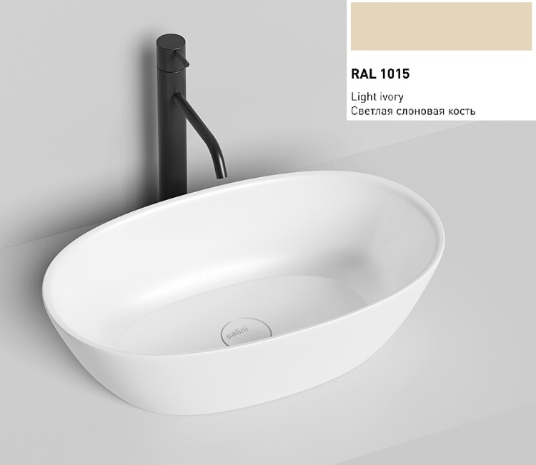Раковина, Salini, Sofia, ширина, мм-555, глубина, мм-330, высота, мм-150, тип установки-накладной (настольный), отверстия для смесителя-отсутствуют, без перелива, без донного клапана, материал-искусственный камень, S-Stone, цвет внутри и снаружи-RAL1015 матовый Раковина, Salini, Sofia, шгв 555*330*150, отверстия для смесителя-отсутствуют, цвет внутри и снаружи-RAL1015 матовый