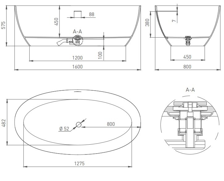 Ванна, Salini, ALDA, ширина, мм-1600, глубина, мм-800, высота, мм-575, водоизмещение (л)-302, тип установки-отдельностоящий, форма-овальная, сифон, интегрированный слив-перелив-в комплекте, диаметр слива, мм-52, донный клапан "Up&Down"-RAL9011, материал-искусственный камень, S-Stone, цвет внутри и снаружи-RAL9011 матовый, фурнитура-в цвет изделия Ванна, Salini, ALDA, шгв 1600*800*575, цвет внутри и снаружи-RAL9011 матовый/ДК RAL9011