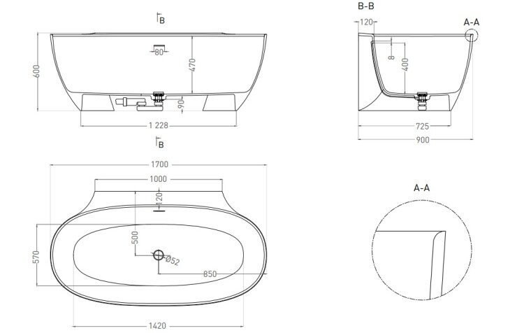 Ванна, Salini, ALDA Wall, ширина, мм-1707, глубина, мм-905, высота, мм-610, водоизмещение (л)-350, тип установки-пристенный, форма-овальная, панель-есть, слив-перелив-в комплекте, диаметр слива, мм-52, в комплекте-сифон, донный клапан Click-clack в цвет изделия с логотипом Salini, материал-S-Sense (литьевой мрамор), цвет-белый Ванна, Salini, ALDA Wall, шгв 1707*905*610, цвет-белый