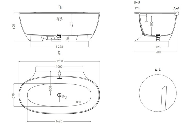 Ванна, Salini, ALDA Wall, ширина, мм-1703, глубина, мм-895, высота, мм-610, водоизмещение (л)-350, тип установки-пристенный, форма-овальная, панель-есть, интегрированный слив-перелив-в комплекте, диаметр слива, мм-52, в комплекте-сифон, донный клапан Click-clack в цвет изделия с логотипом Salini, материал-S-Stone (искуственный камень), цвет-белый матовый Ванна, Salini, ALDA Wall, шгв 1703*895*610, цвет-белый матовый