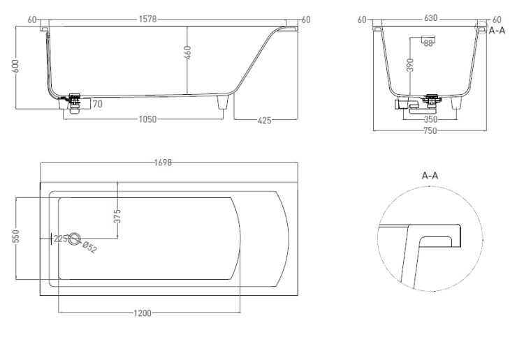 Ванна, Salini, Cascata KIT, ширина, мм-1706, глубина, мм-751, высота, мм-600, водоизмещение (л)-275, тип установки-встраиваемый, форма-прямоугольная, интегрированный слив-перелив-в комплекте, диаметр слива, мм-52, ножки-есть, донный клапан "Up&Down" белый, сифон, материал-S-Sense (литьевой мрамор), цвет-белый матовый Ванна, Salini, Cascata KIT, шгв 1706*751*600, цвет-белый матовый