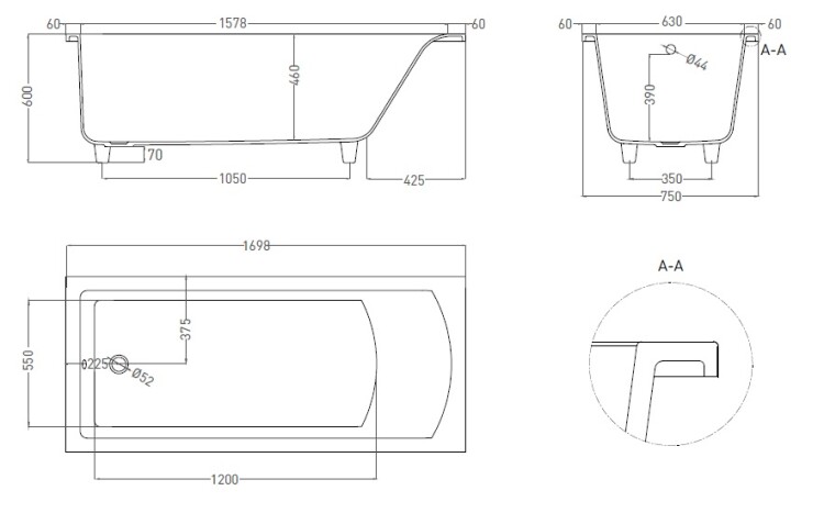 Ванна, Salini, Cascata, ширина, мм-1698, глубина, мм-747, высота, мм-600, водоизмещение (л)-275, тип установки-встраиваемый, форма-прямоугольная, слив-перелив-необходимо заказать, диаметр слива, мм-52, ножки-есть, материал-S-Stone (искуственный камень), цвет-белый матовый Ванна, Salini, Cascata, шгв 1698*747*600, цвет-белый матовый