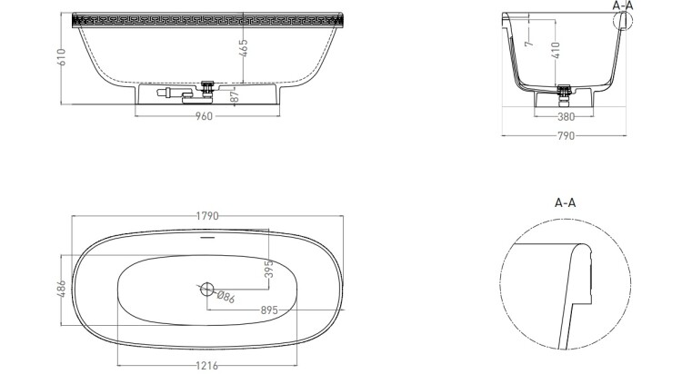 Ванна, Salini, Greca Meander, ширина, мм-1800, глубина, мм-800, высота, мм-610, водоизмещение (л)-334, тип установки-отдельностоящий, форма-овальная, сифон, интегрированный слив-перелив-в комплекте, диаметр слива, мм-86, материал-S-Stone (искуственный камень), цвет-белый матовый, фурнитура-белая Ванна, Salini, Greca Meander, шгв 1800*800*610, цвет-белый матовый