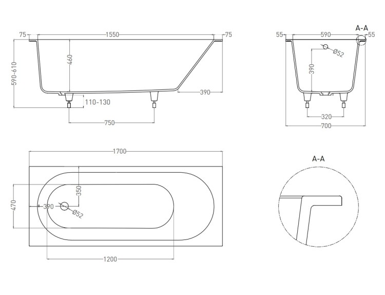 Ванна, Salini, Ornella, ширина, мм-1700, глубина, мм-700, высота, мм-600, водоизмещение (л)-240, тип установки-встраиваемый, форма-прямоугольная, чаша-овальная, слив-перелив-необходимо заказать, диаметр слива, мм-52, ножки-есть, материал-S-Sense (литьевой мрамор), цвет-белый матовый (Matt White, Bianco Opaco) Ванна, Salini, Ornella, шгв 1700*700*600, цвет-белый матовый (Matt White, Bianco Opaco)