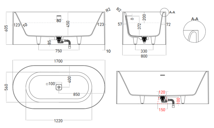 Ванна, Salini, PERLA, ширина, мм-1700, глубина, мм-800, высота, мм-605, водоизмещение (л)-270, тип установки-отдельностоящий, форма-овальная, панель-есть, в комплекте-интегрированный слив-перелив, сифон, накладка на сливное отверстие в цвет изделия, донный клапан Click-Clack, ножки (нерегулируемые), диаметр слива, мм-120, материал-S-Sense (литьевой мрамор), цвет-RAL 7005 Ванна, Salini, PERLA, шгв 1700*800*605, цвет-RAL 7005