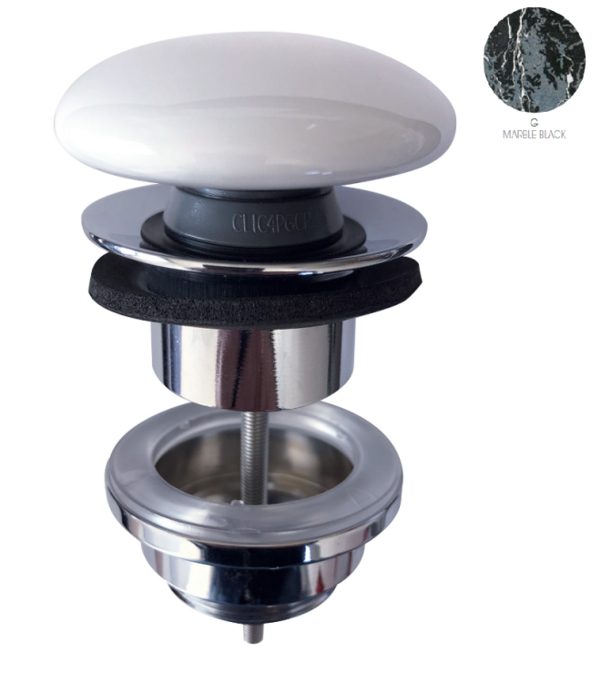 Донный клапан, Scarabeo, для раковин, нажимной Click Clack, 1 1/4", форма крышки-круглая, диаметр крышки, мм-72, материал клапана-латунь, цвет клапана-Brushed Gold, материал крышки-керамика, цвет крышки-черный мрамор Донный клапан, Scarabeo, для раковин, 1 1/4", цвет-Brushed Gold/черный мрамор