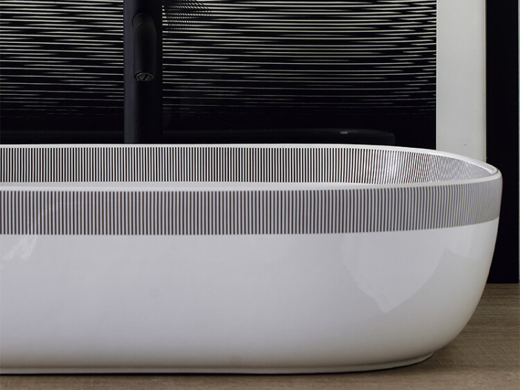 Раковина, Scarabeo, Glam, ширина, мм-560, глубина, мм-390, высота, мм-140, тип установки-накладной (настольный), отверстия для смесителя-отсутствуют, без перелива, без донного клапана, материал-керамика, цвет-белый декор Black line strip Раковина, Scarabeo, Glam, шгв 560*390*140, отверстия для смесителя-отсутствуют, цвет-белый декор Black line strip