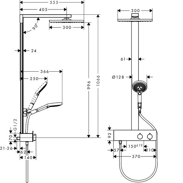 Душевая стойка, Hansgrohe, Raindance E, смеситель-есть, тип регулирования воды-термостатический картридж, верхний душ-есть, форма верхнего душа-квадратная, размер верхнего душа-300, держатель верхнего душа-есть, вынос, мм-405, количество режимов верхнего душа-1, тип струи верхнего душа-RainAir, размер штанги, мм-1066, ручной душ-есть, диаметр лейки, мм-128, форма лейки-круглая, шланг-есть, цвет-хром, держатель ручного душа регулируется в пределах 90°, поворачивается вправо и влево, перемещается вверх и вниз, шарнирное соединение: регулируемый угол верхнего душа, поверхность полочки: анодированный алюминий, поверхность крышки-зеркальное стекло, предохранительный ограничитель при 40°C, пользовательское управление посредством вращения рукоятки, соединительная резьба G ½ Душевая стойка, Hansgrohe, Raindance E, цвет-хром