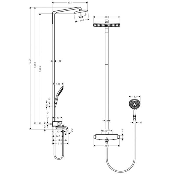 Душевая стойка, Hansgrohe, Raindance E, смеситель-есть, тип открывания воды-двухвентильный, тип регулирования воды-термостатический картридж, излив-есть, вынос излива, мм-210, верхний душ-есть, форма верхнего душа-прямоугольная, размер верхнего душа-360*190, держатель верхнего душа-есть, вынос, мм-487, количество режимов верхнего душа-1, тип струи верхнего душа-RainAir, размер штанги, мм-1556, ручной душ-есть, размер ручного душа-120, количество режимов ручного душа-3, тип струи ручного душа-RainAir, Rain, массажная струя, шланг-есть, размер шланга, мм-1600, цвет-белый/хром Душевая стойка, Hansgrohe, Raindance E, цвет-белый/хром