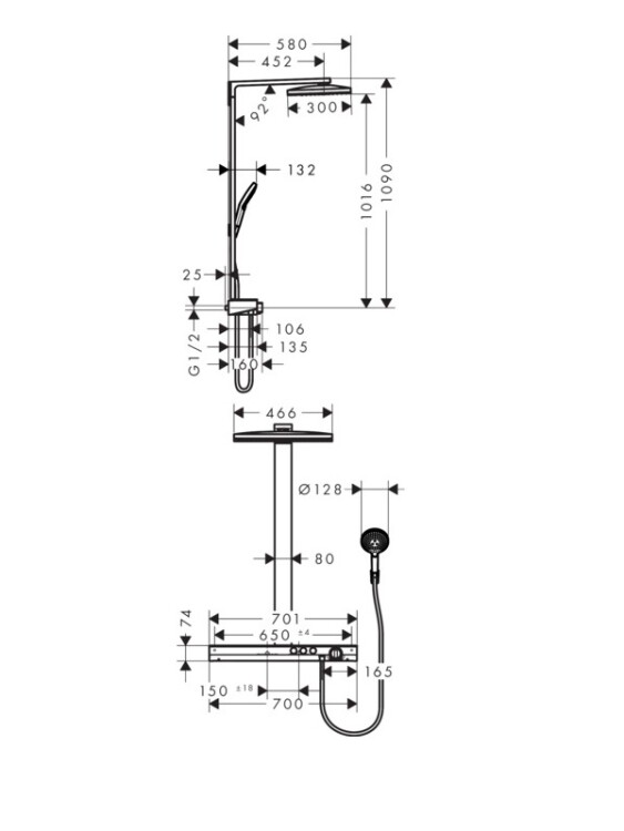 Душевая стойка, Hansgrohe, Rainmaker Select, тип регулирования воды-термостатический картридж, верхний душ-есть, форма верхнего душа-прямоугольная, размер верхнего душа-460*300, держатель верхнего душа-есть, вынос, мм-450, количество режимов верхнего душа-2, тип струи верхнего душа-Rain, RainStream, размер штанги, мм-1090, ручной душ-есть, размер ручного душа-120, количество режимов ручного душа-3, тип струи ручного душа-Rain, RainAir, WhirlAir, шланг-есть, размер шланга, мм-1600, цвет-белый/хром Душевая стойка, Hansgrohe, Rainmaker Select, цвет-белый/хром