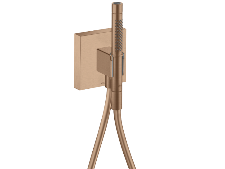 Душевой набор, Hansgrohe, Axor Starck, размер душевого диска, мм-24*139, форма лейки-цилиндрическая, количество режимов-2, тип струи-обычная струя, мягкая струя, держатель для душа-есть, шланг-есть, длина шланга, мм-1250, шланговое подключение-есть, цвет-шлифованное красное золото, металлическая розетка,мм-120*120 Душевой набор, Hansgrohe, Axor Starck, цвет-шлифованное красное золото