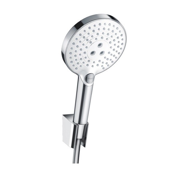 Душевой набор, Hansgrohe, Raindance Select S, диаметр лейки, мм-125, форма лейки-круглая, количество режимов-3, тип струи-RainAir, Rain, WhirlAir, держатель для душа-есть, шланг-есть, длина шланга, мм-1600, цвет-белый/хром Душевой набор, Hansgrohe, Raindance Select S, цвет-белый/хром