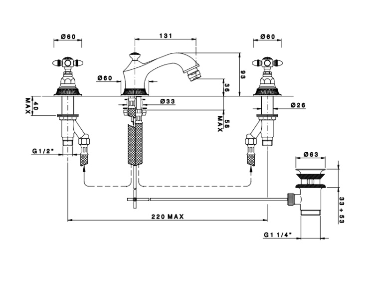 Смеситель для биде, Nicolazzi, Impero, тип открывания воды-двухвентильный, отверстия для монтажа-3, вынос излива, мм-131, донный клапан-есть, цвет-Gold Смеситель для биде, Nicolazzi, Impero, цвет-Gold