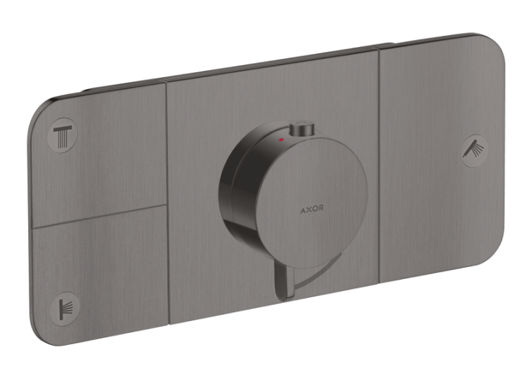 Смеситель для душа, Hansgrohe, Axor One, тип регулирования воды-термостатический картридж, тип установки-встраиваемый, внутренняя часть-необходимо заказать, цвет-шлифованный черный хром, 3 потребителя и 1 дополнительный потребитель, включение/выключение кнопкой Select, предохранительный ограничитель при 40°C, регулируемое ограничение температуры, термостат с возможностью термической дезинфекции, клапан обратного тока воды Смеситель для душа, Hansgrohe, Axor One, цвет-шлифованный черный хром