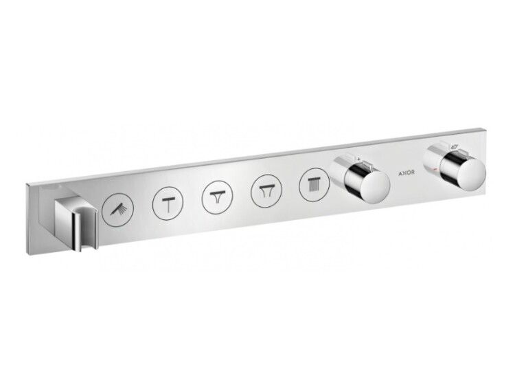 Смеситель для душа, Hansgrohe, Axor ShowerSolutions, тип регулирования воды-термостатический картридж, тип установки-встраиваемый, внутренняя часть-необходимо заказать, цвет-хром, 5 потребителей, кнопка включения/выключения Select, предохранительный ограничитель при 40°C, регулируемое ограничение температуры, комплект поставки-рукоятки, гильзы, розетка, функциональный блок, входят FixFit и Porter, защита от обратного тока воды, кнопка Rain large, кнопка ручной душ, кнопка режима моно Смеситель для душа, Hansgrohe, Axor ShowerSolutions, цвет-хром