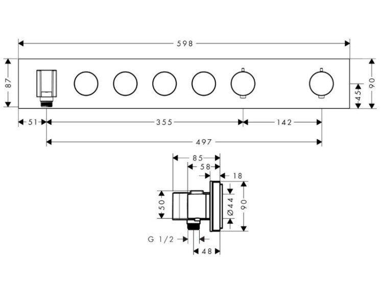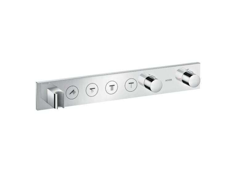 Смеситель для душа, Hansgrohe, Axor ShowerSolutions, Select 600/90, тип открывания воды-вентильный, тип регулирования воды-термостатический картридж, тип установки-встраиваемый, внутренняя часть-необходимо заказать, цвет-полированное золото, предохранительный ограничитель при 40°C, регулируемое ограничение температуры, комплектация-кнопка включения/выключения Select для 4 потребителей, FixFit и Porter, кнопка Rain large, кнопка ручной душ, кнопка водопад, кнопка режима моно Смеситель для душа, Hansgrohe, Axor ShowerSolutions, Select 600/90, цвет-полированное золото