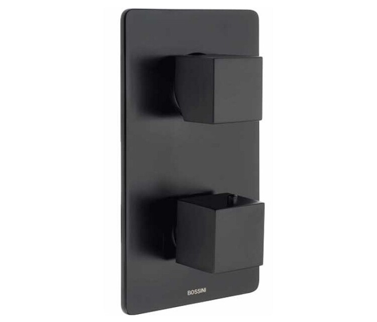 Смеситель для душа, Bossini, CUBE, тип открывания воды-однорычажный, тип регулирования воды-термостатический картридж, монтаж-настенный встраиваемый, отверстия для монтажа-2, внутренняя часть-необходимо заказать, с девиатором 2-5 выходов, цвет-черный матовый Смеситель для душа, Bossini, CUBE, цвет-черный матовый
