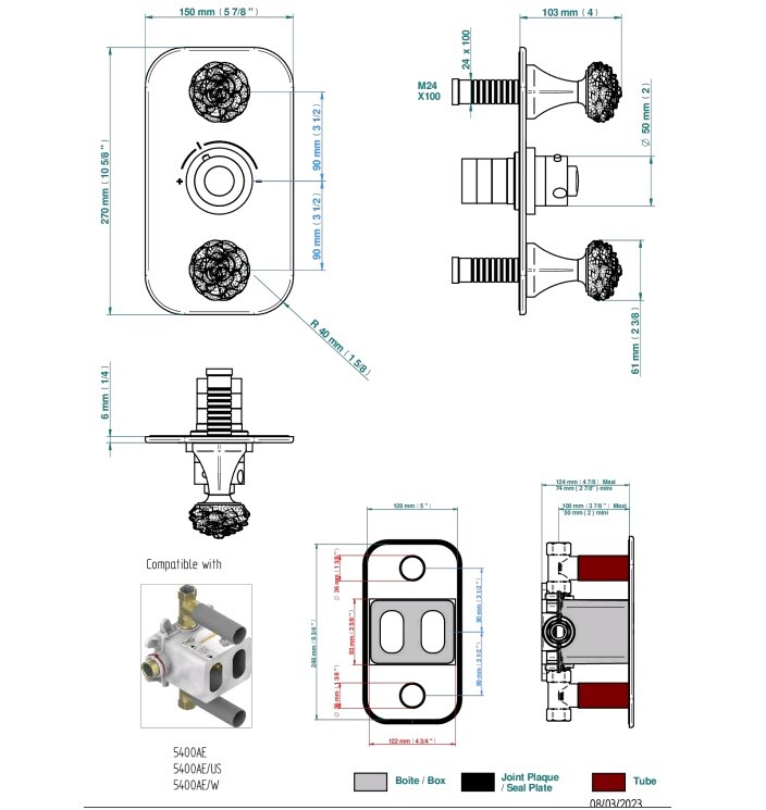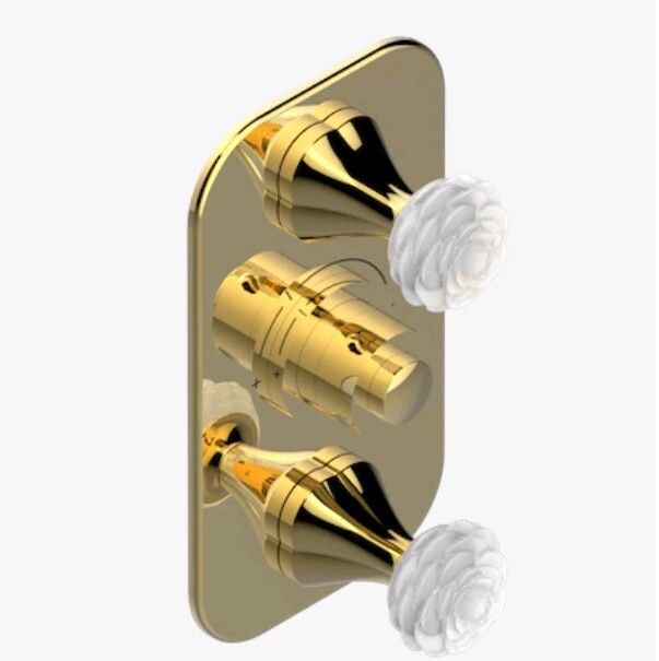 Смеситель для душа, THG, Camélia Clear crystal, тип открывания воды-вентильный, тип регулирования воды-термостатический картридж, монтаж-настенный встраиваемый, внутренняя часть-необходимо заказать, ручки-цветок камелии в белом цвете, цвет-золотистый PVD Смеситель для душа, THG, Camélia Clear crystal, ручки-цветок камелии в белом цвете, цвет-золотистый PVD