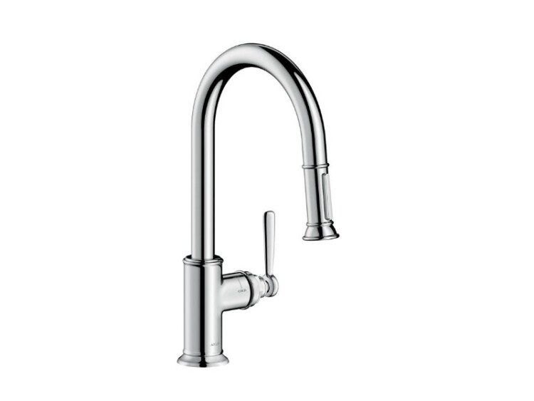 Смеситель для кухни, Hansgrohe, Axor Montreux, тип открывания воды-однорычажный, тип регулирования воды-керамический узел смешивания, отверстия для монтажа-1, высота, мм-396, вынос излива, мм-213, тип излива-поворотный, выдвижной, дополнительные функции-выдвижной душ, тип подводки-гибкая, стандарт подвода воды-3/8", цвет-сталь, обычная и душевая струя, переключение струи в исходное положение нажатием кнопки, магнитная система крепления душа MagFit Смеситель для кухни, Hansgrohe, Axor Montreux, цвет-сталь