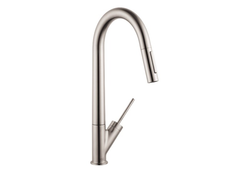 Смеситель для кухни, Hansgrohe, Axor Starck, тип открывания воды-однорычажный, тип регулирования воды-керамический узел смешивания, отверстия для монтажа-1, высота, мм-450, вынос излива, мм-235, тип излива-поворотный, выдвижной, угол поворота излива-регулировка на 2 уровня, на 110° или 150°, дополнительные функции-душ, вид ручки-джойстикового типа, тип подводки-гибкая, стандарт подвода воды-3/8", цвет-сталь, с возможностью размещения рукоятки справа или слева, переключение струи в исходное положение нажатием кнопки, магнитная система крепления душа MagFit, душевой шланг Quick-Connect Смеситель для кухни, Hansgrohe, Axor Starck, цвет-сталь