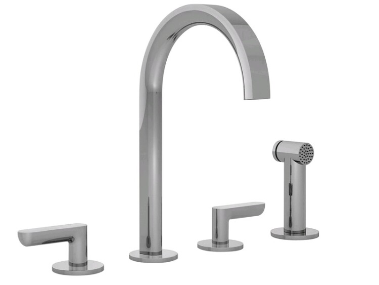 Смеситель для кухни, Fantini, Icona Deco, тип открывания воды-двухрычажный, тип регулирования воды-керамический картридж, отверстия для монтажа-4, высота, мм-335, вынос излива, мм-215, тип излива-поворотный, дополнительные функции-выдвижной душ, с 1 режимом работы и с нажимной кнопкой вкл/выкл, цвет-хром, в комплекте-подводка, ручки Смеситель для кухни, Fantini, Icona Deco, цвет-хром