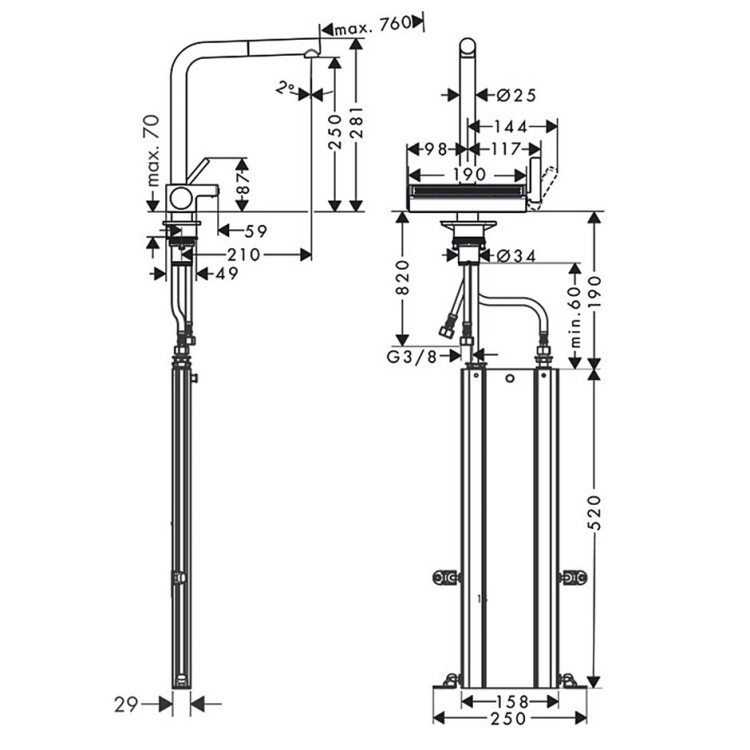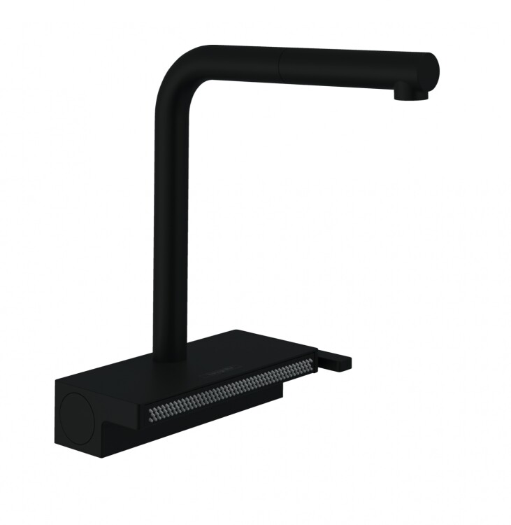 Смеситель для кухни, Hansgrohe, Aquno Select M81, тип открывания воды-рычажный, тип регулирования воды-керамический картридж, монтаж-на раковину/столешницу, отверстия для монтажа-1, высота, мм-281, вынос излива, мм-215, тип излива-L-образный, выдвижной, поворотный, тип подводки-гибкая, стандарт подвода воды-3/8", цвет-черный матовый, с вытяжным душем Смеситель для кухни, Hansgrohe, Aquno Select M81, цвет-черный матовый
