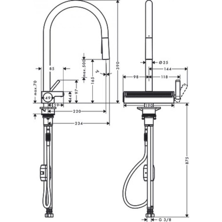 Смеситель для кухни, Hansgrohe, Aquno Select M81, многофункциональный дуршлаг, тип открывания воды-однорычажный, тип регулирования воды-керамический картридж, монтаж-на раковину/столешницу, отверстия для монтажа-1, высота, мм-390, вынос излива, мм-220, тип излива-выдвижной, с вытяжным душем, поворотный на 60°, 110° или 150°, 3 типа струи-ламинарная струя, душевая струя, SatinFlow, переключение струи SatinFlow на струю из излива осуществляется нажатием кнопки, магнитная система крепления душа MagFit, тип подводки-гибкая, стандарт подвода воды-3/8", цвет-черный матовый Смеситель для кухни, Hansgrohe, Aquno Select M81, цвет-черный матовый
