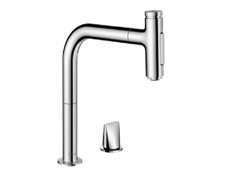 Смеситель для кухни, Hansgrohe, Metris Select M71, sBox, тип открывания воды-однорычажный, тип регулирования воды-керамический картридж, монтаж-на раковину/столешницу, отверстия для монтажа-2, высота, мм-320, вынос излива, мм-221, тип излива-выдвижной, поворотный 110° или 150°, 2 режима струи-ламинарная струя, душевая струя, корпус для шланга, кнопка Select для комфортного включения/выключения воды, магнитная система крепления душа MagFit, тип подводки-гибкая, стандарт подвода воды-3/8", цвет-шлифованный черный хром Смеситель для кухни, Hansgrohe, Metris Select M71, sBox, цвет-шлифованный черный хром
