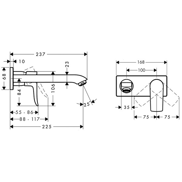 Смеситель для раковины, Hansgrohe, Metris, тип открывания воды-рычажный, тип регулирования воды-керамический картридж, монтаж-вертикальный встраиваемый (настенный), отверстия для монтажа-2, высота, мм-68, вынос излива, мм-225, тип излива-неподвижный, внутренняя часть-необходимо заказать, цвет-хром Смеситель для раковины, Hansgrohe, Metris, цвет-хром