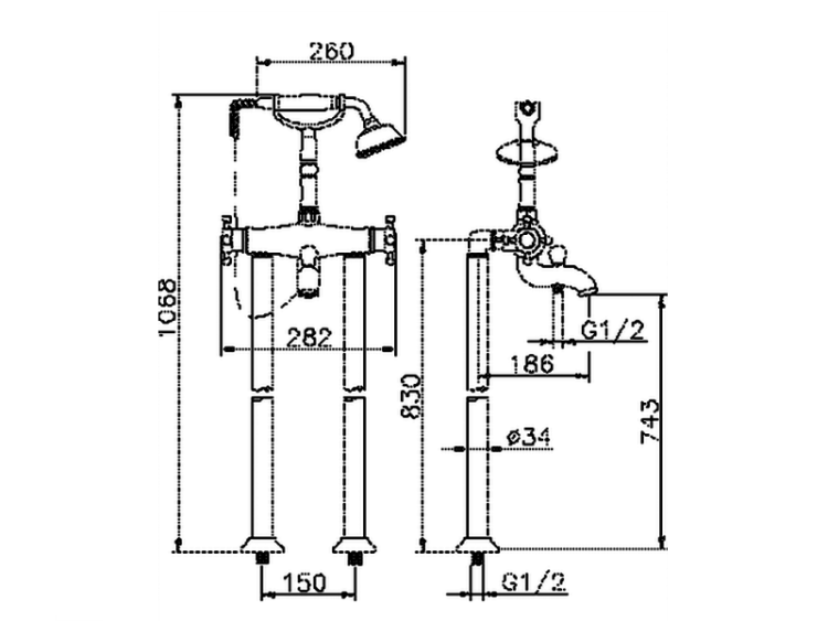 Смеситель для ванны и душа, Cisal, Victorian, тип регулирования воды-термостатический картридж, тип установки-напольный, отверстия для монтажа-2, вынос излива, мм-186, комплектация-ручной душ, держатель ручного душа, шланг, цвет-хром Смеситель для ванны и душа, Cisal, Victorian, цвет-хром