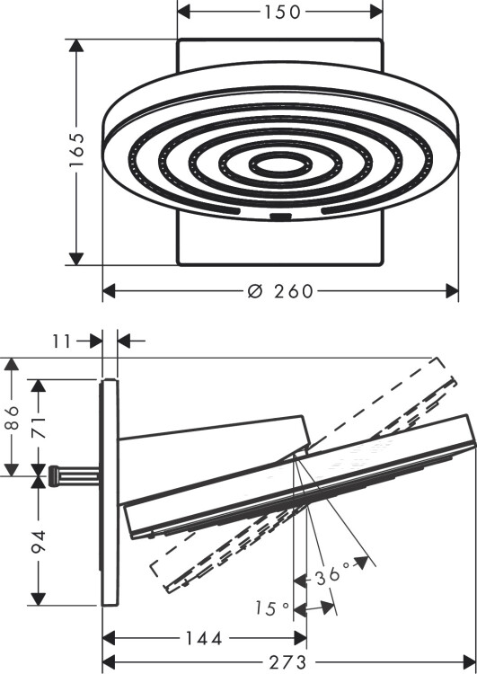 Верхний душ, Hansgrohe, Pulsify S, тип установки-настенный встраиваемый, размер душевого диска, мм-260*260, форма-круглая, количество режимов-2, тип струи-PowderRain, Intense PowderRain, внутренняя часть-необходимо заказать, цвет-хром Верхний душ, Hansgrohe, Pulsify S, 260*260, цвет-хром