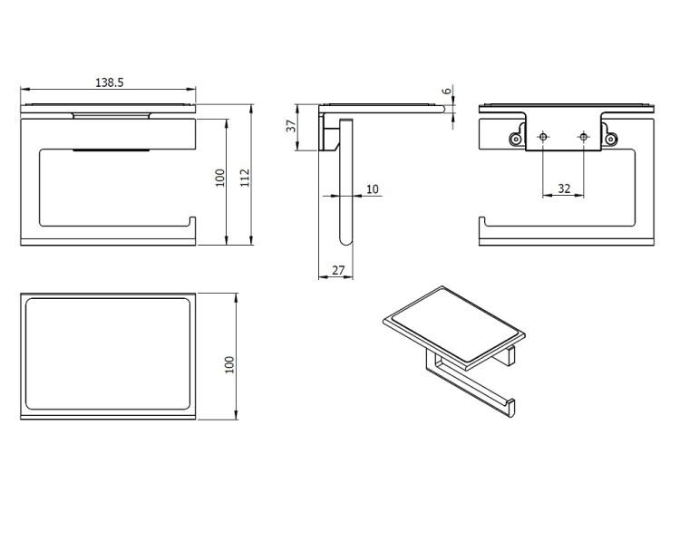 Бумагодержатель, Splendy, Inspiration R, с полочкой, без крышки, ширина, мм-138.5, глубина, мм-100, высота, мм-112, тип установки-настенный, цвет-хром Бумагодержатель, Splendy, Inspiration R, шгв 138.5*100*112, с полочкой, цвет-хром